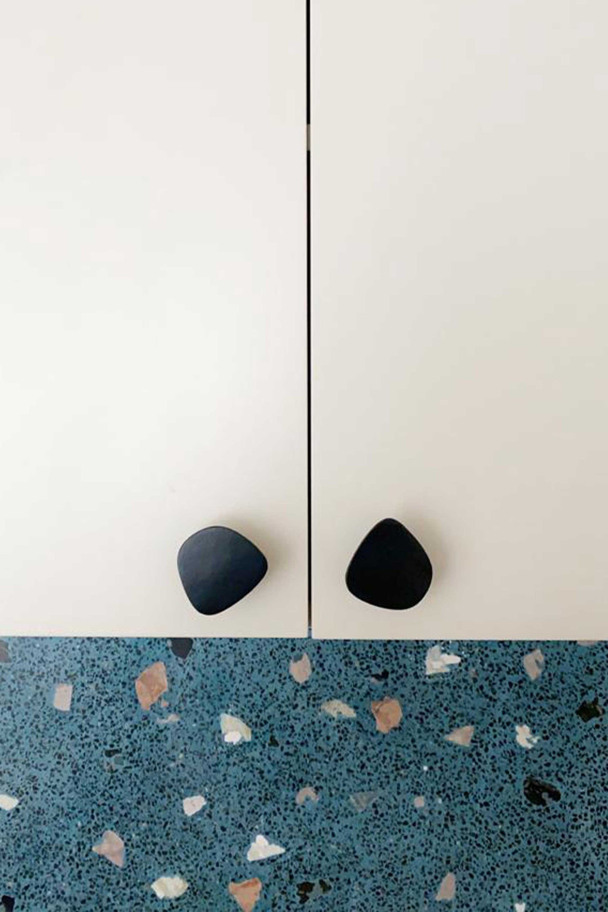 De bordes suaves, como una piedra del terrazo salida y colocada de tirador en el proyecto Santa Fé. Un diseño sutil que da un toque especial al mobiliario. No dudes en colocarlos y que queden en diferentes posiciones para darle más movimiento. También se pueden combinar ambas medidas de 5 y 7 cm.